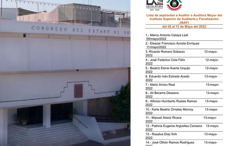 Hermosillo, Sonora, 18 de mayo de 2022.- En cumplimiento a la Base Cuarta de la Convocatoria Pública para designar a la o el ciudadano que habrá de ocupar el cargo de Auditor Mayor del Instituto Superior de Auditoría y Fiscalización, el Congreso del Estado informa que se registraron 14 aspirante...