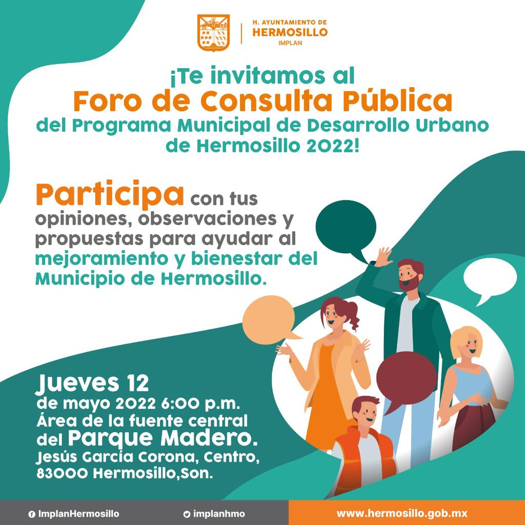Hermosillo, Sonora; mayo 12 de 2022.- A partir de este jueves 12 de mayo de 2022, el Instituto Municipal de Planeación Urbana y del Espacio Público (IMPLAN), del Ayuntamiento de Hermosillo, arranca un ciclo de consultas vecinales con convocatoria abierta a quienes deseen hacer sus aportes a l...