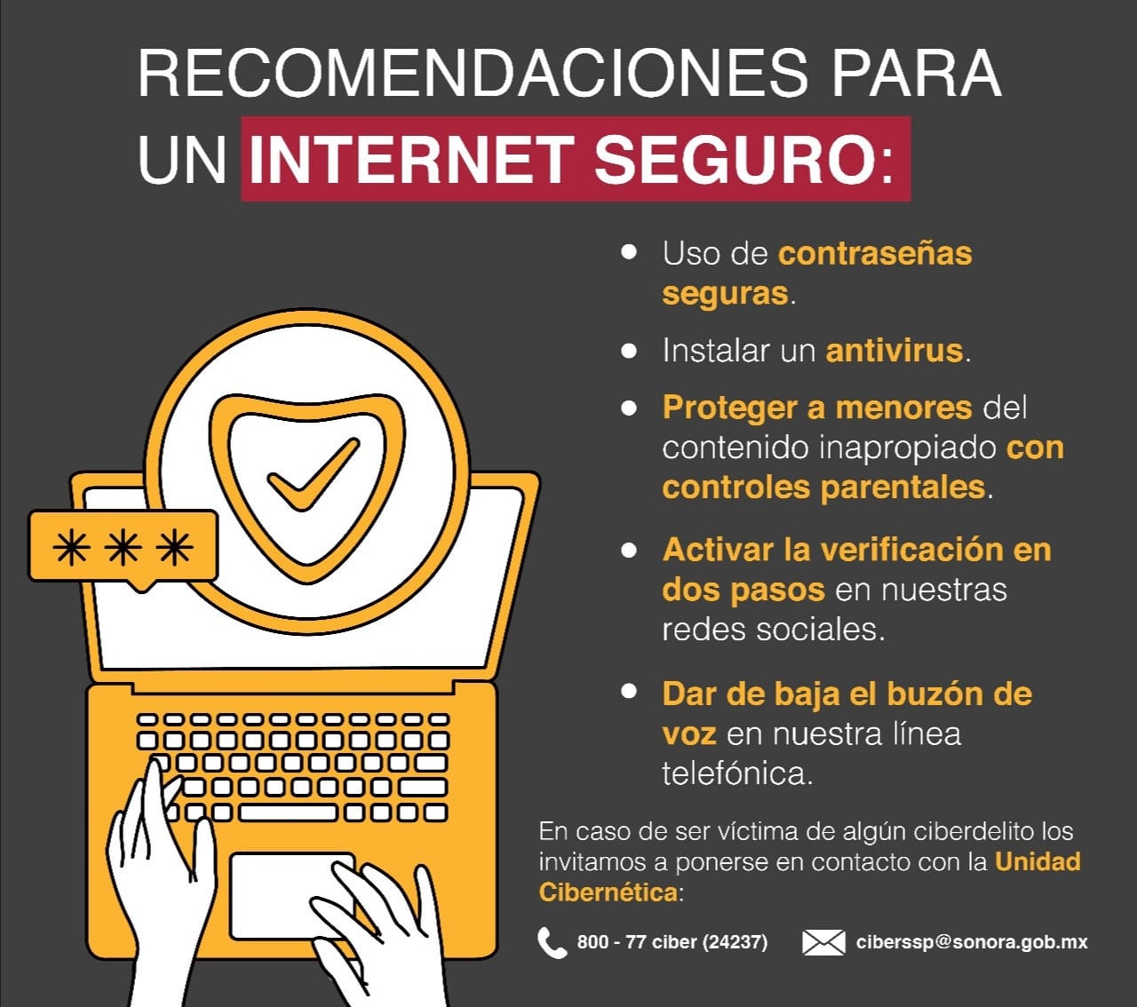 Hermosillo, Sonora; 8 de febrero de 2022.- Para una navegación segura y prevenir ser víctima de delitos, la Unidad Cibernética de la Secretaría de Seguridad Pública (SSP) de Sonora, recomendó a las y los usuarios de la web mantenerse informados sobre las nuevas modalidades que utilizan l...