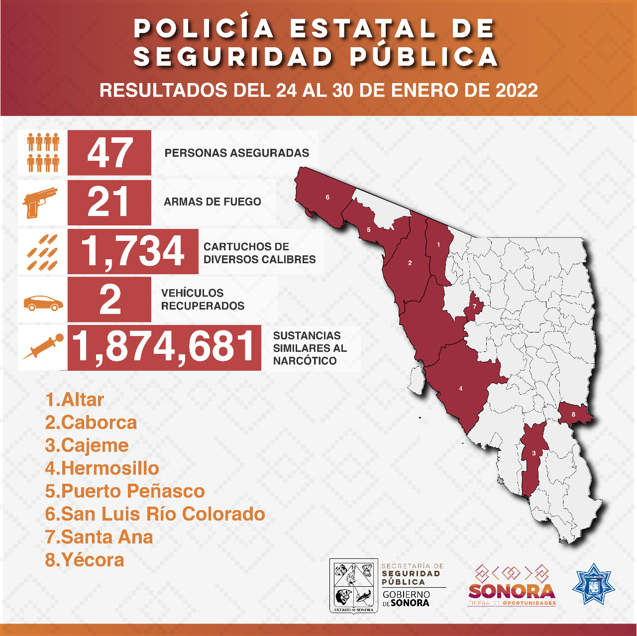 Hermosillo, Sonora; a 31 de enero del 2022.- Suman 47 personas aseguradas durante una semana de operativos preventivos que realizó la Policía Estatal de Seguridad Pública (PESP) en coordinación con los tres órdenes de gobierno en municipios de Sonora.En la semana del 24 al 30 de enero, agentes ...