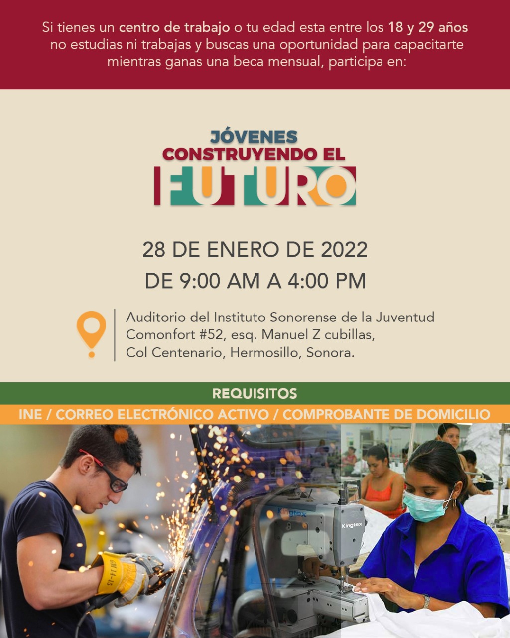 Hermosillo, Sonora; 26 de enero de 2022.- El programa Jóvenes Construyendo el Futuro y el Gobierno de Sonora, a través del Instituto Sonorense de la Juventud (ISJ), invitan a las y los jóvenes de 18 a 29 años que en este momento no estudian ni trabajan a que se integren a uno de los progra...