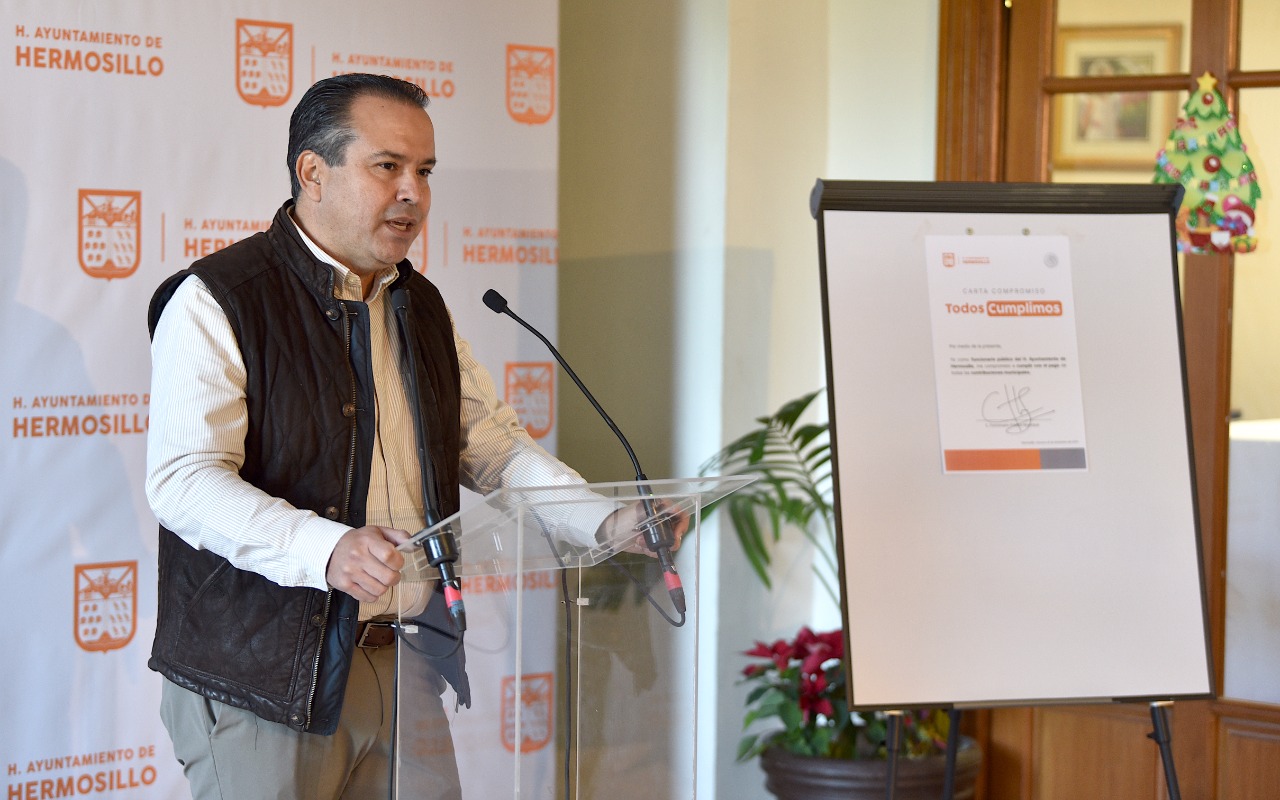 Hermosillo, Sonora, 06 de diciembre de 2021.- Hasta el 31 de diciembre se amplió el periodo de descuento de recargos en pago de adeudos de predial, multas y agua potable anunció el Presidente Municipal, Antonio Astiazarán Gutiérrez, quien además firmó la carta compromiso para que tr...