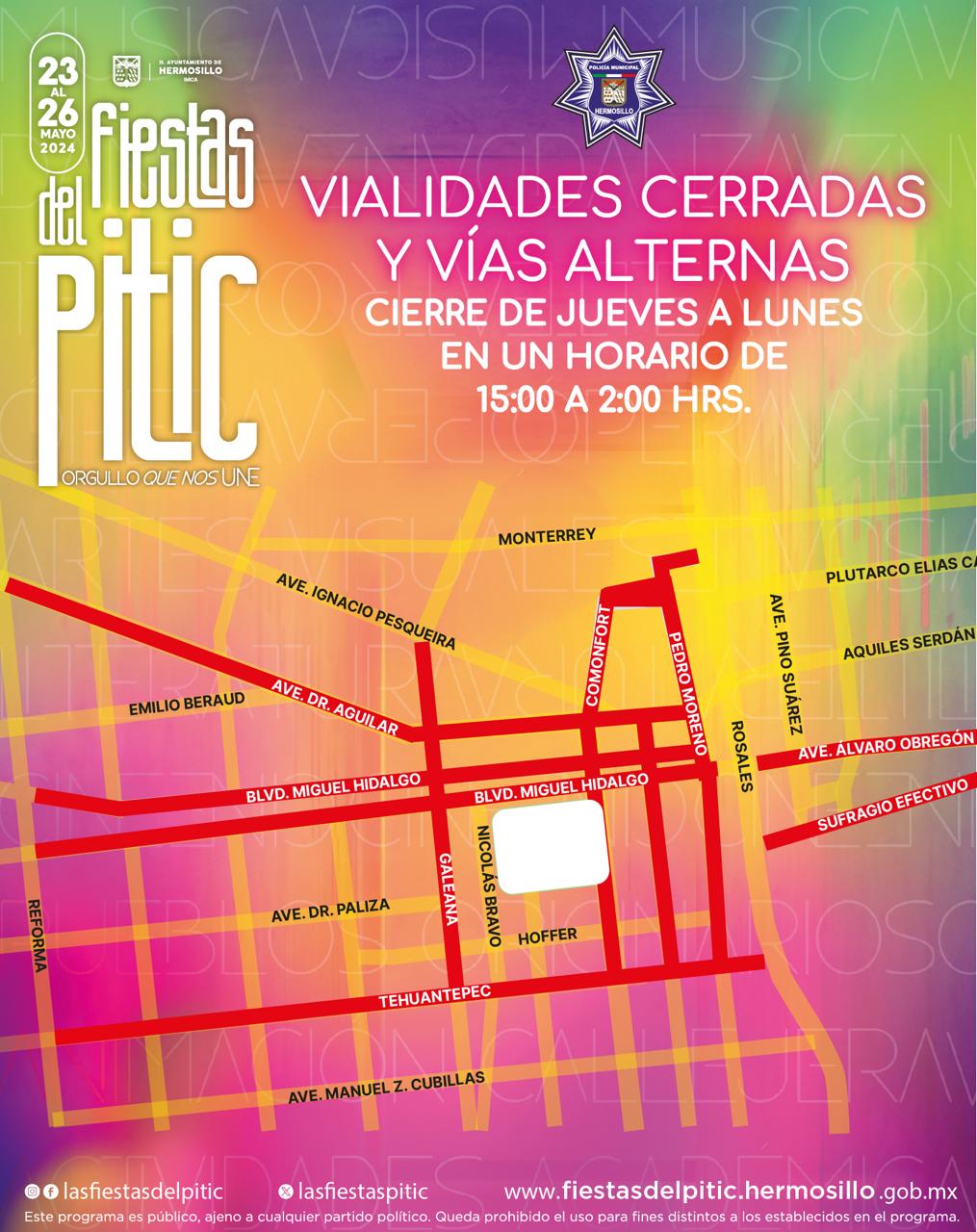 Hermosillo, Sonora; 21 de mayo, 2024.- El Departamento de Tránsito Municipal exhorta a la ciudadanía a circular con precaución y hacer uso de vías alternas ante el cierre de vialidades durante el desarrollo de las Fiestas del Pitic 2024, que se llevarán a cabo del jueves 23 al domingo 26 ...