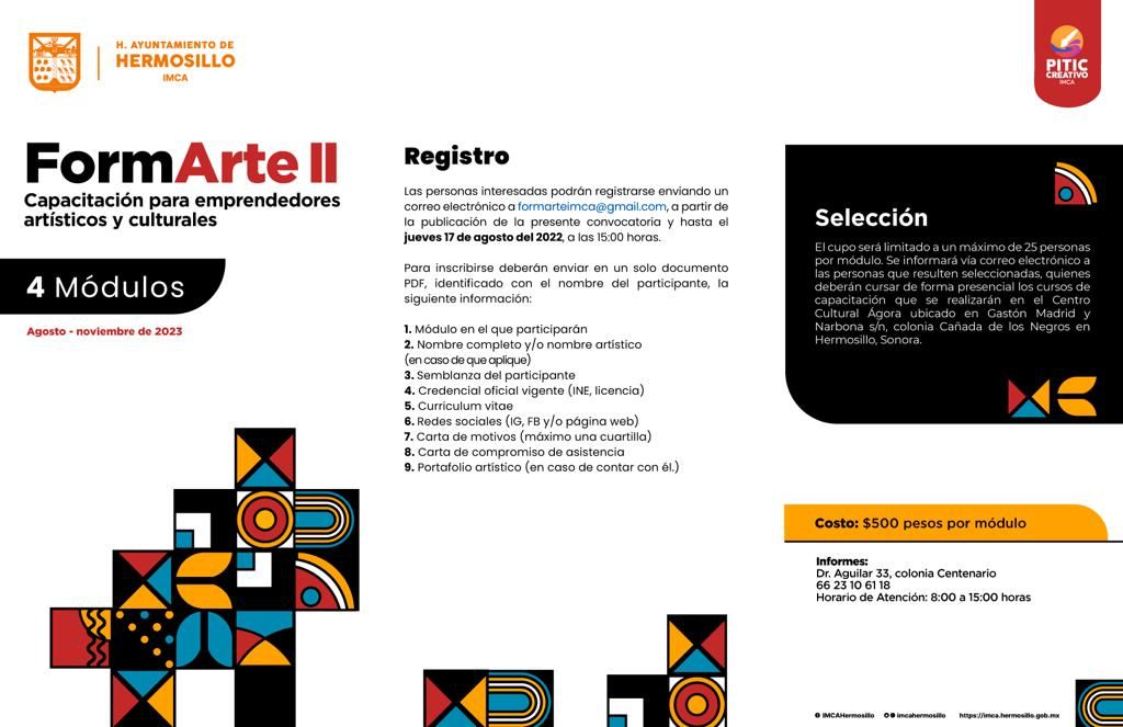 Hermosillo, Sonora; 15 de agosto, 2023.- La convocatoria para inscribirse en las capacitaciones de la segunda edición del programa FormArte del Instituto Municipal de Cultura y Arte (IMCA), dirigida a quienes conforman el gremio artístico y cultural de la ciudad, cerrará este jueves 17.Dicha...