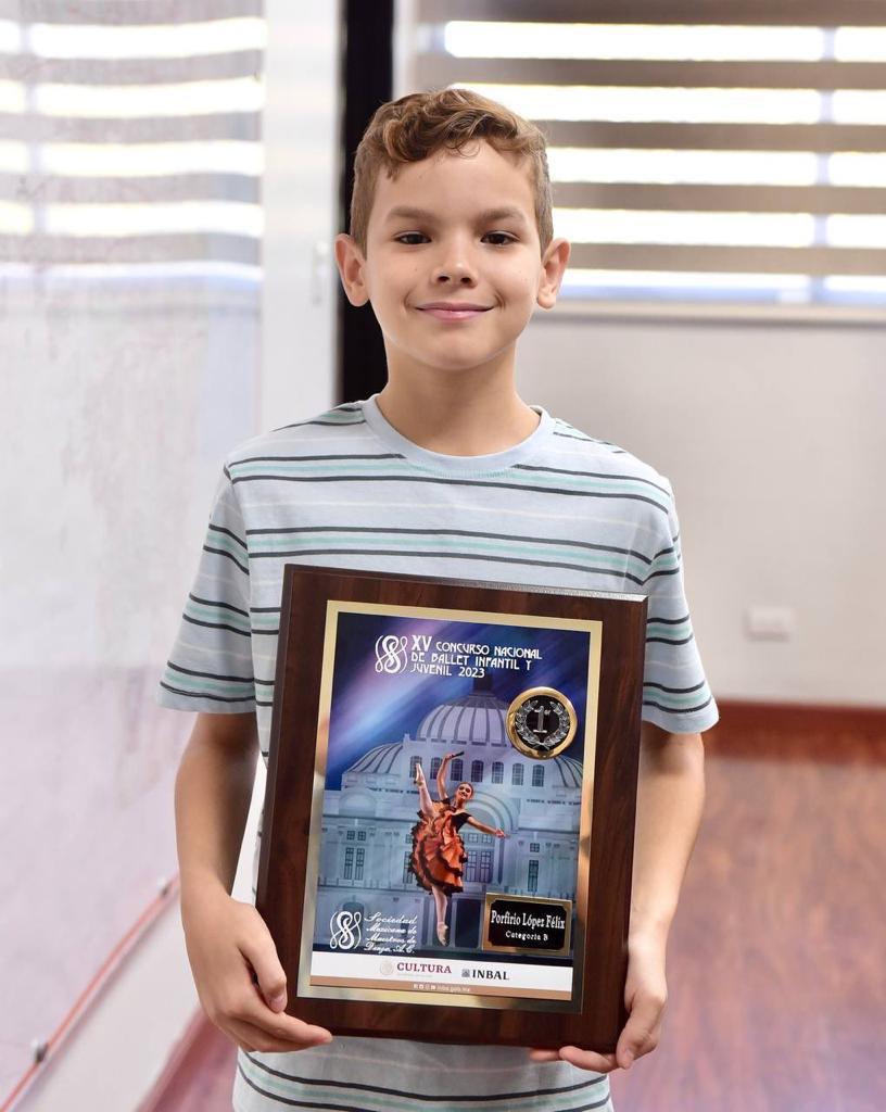 Felicita Toño Astiazarán a Porfirio López Félix, niño ganador del XV Concurso Nacional de Ballet Infantil y Juvenil 2023