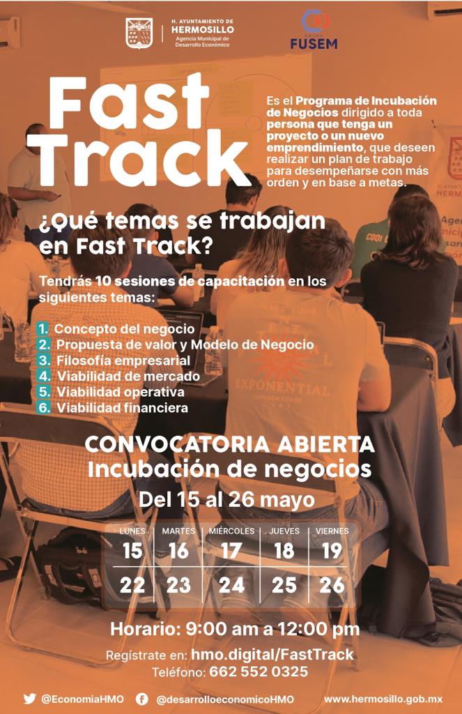Hermosillo, Sonora; 9 de mayo, 2023.- Anunció el programa de incubación de negocios Fast Track dirigido a las personas que tengan un proyecto o un nuevo emprendimiento y que deseen realizar un plan de negocio para desempeñarse con más orden y con base a metas, del 15 al 26 de mayo.La direct...