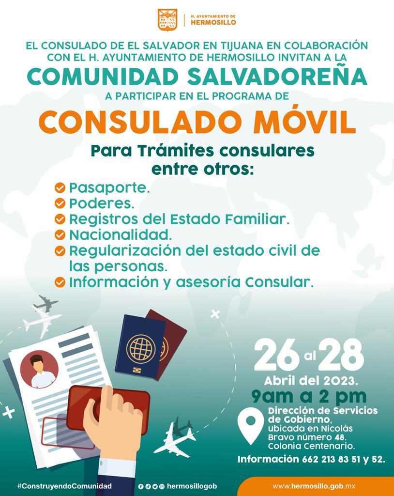 Hermosillo, Sonora; 27 de abril, 2023.- Personas salvadoreñas podrán aprovechar los servicios del consulado de su país con sede en Tijuana, Baja California, hasta este viernes en las oficinas de Servicios Gobierno del Ayuntamiento de Hermosillo.El cónsul de El Salvador con sede en la ciudad...