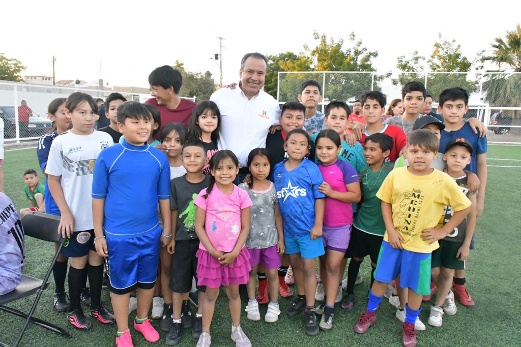 Hermosillo, Sonora; 23 de abril, 2023.- Con la motivación de entrenar en una cancha de futbol en condiciones dignas, niñas y niños de diversos equipos recibieron por parte de Antonio Astiazarán la rehabilitación del parque en Lomas de Linda Vista en el que fue reemplazado el pasto sint&eac...