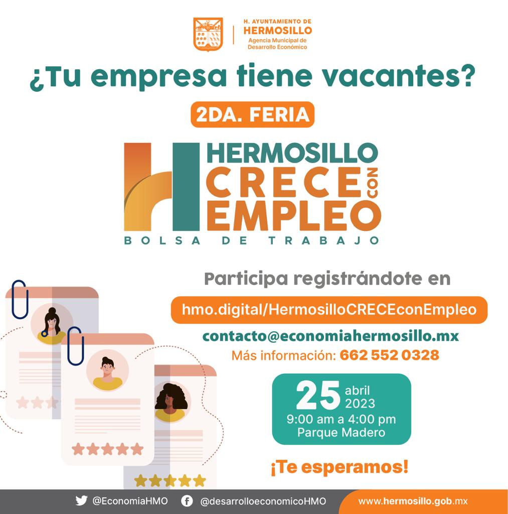 Hermosillo, Sonora; 13 de abril, 2023.- Con el propósito de poner al alcance de quienes buscan empleo formal toda la oferta laboral disponible en la localidad, el Gobierno Municipal de Hermosillo celebrará el próximo 25 de abril, de las 9:00 a las 16:00 horas, la segunda edición de la Feria...