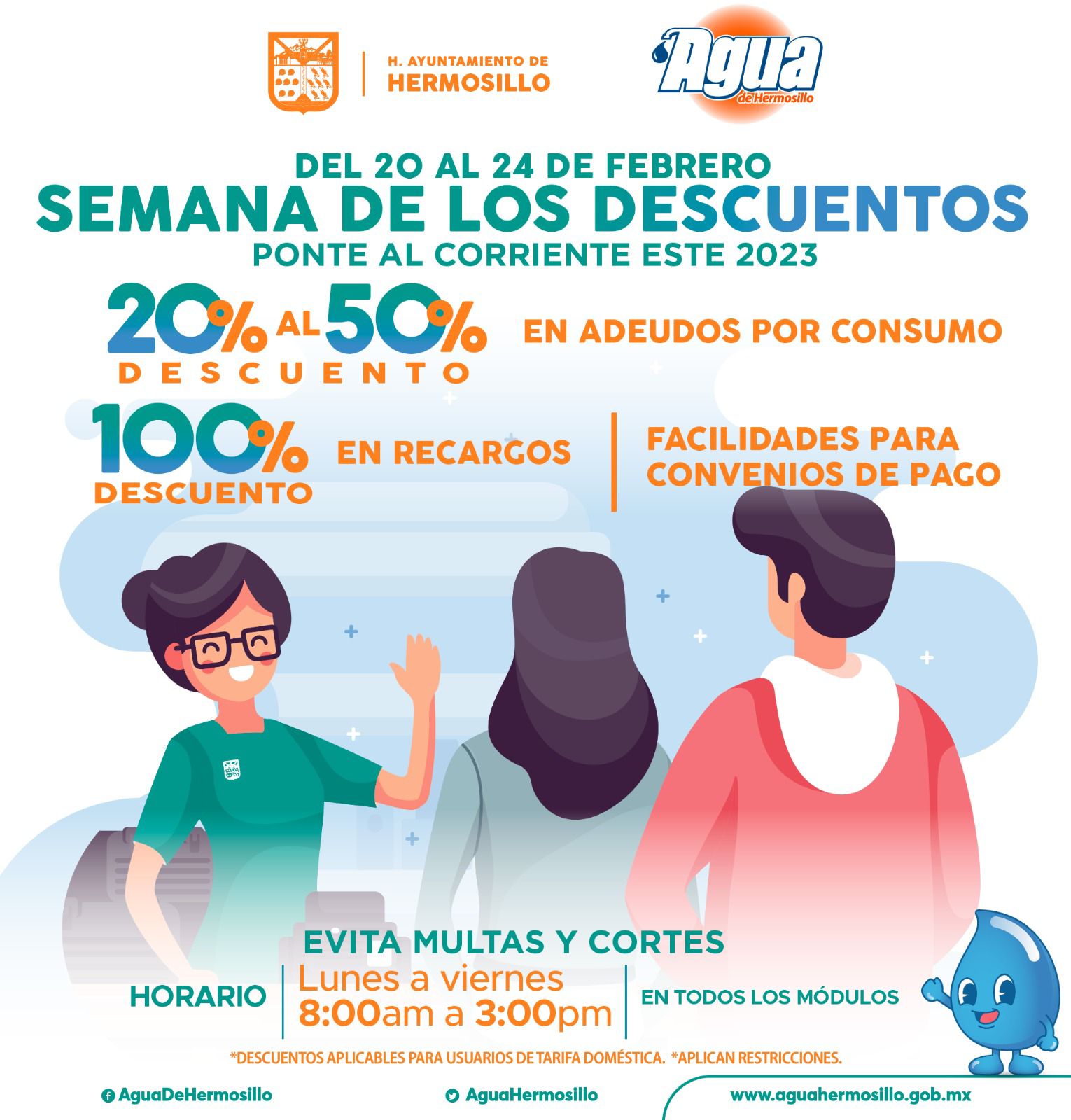 Hermosillo, Sonora; 20 de febrero, 2023.- Con el objetivo de acercar a personas quienes cuentan con adeudos y desean regularizar su estatus para lograr beneficios de Usuario Cumplido, del 20 al 24 de febrero Agua de Hermosillo (AGUAH) realizará la Semana de los Descuentos.El director Comercial...