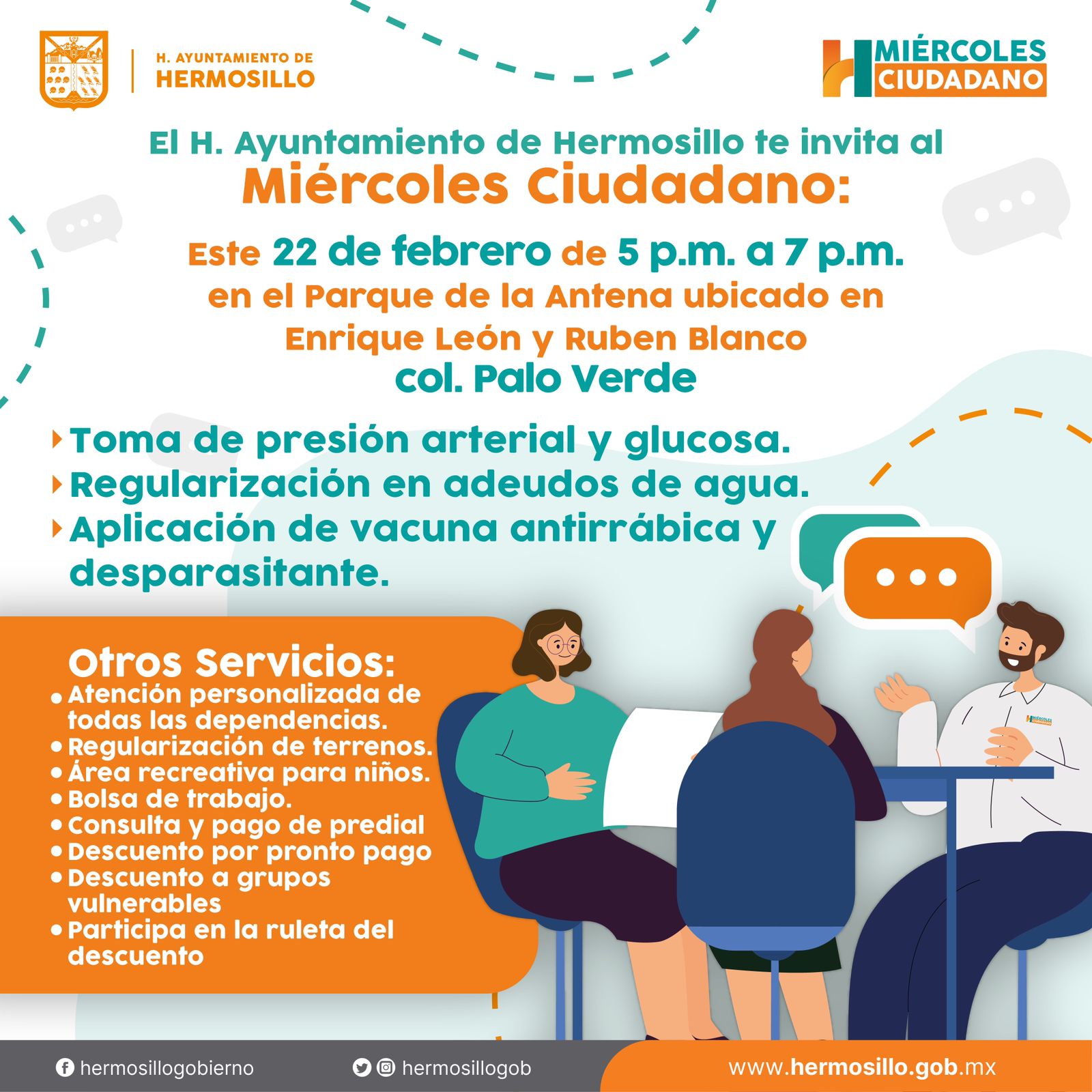 Hermosillo, Sonora; 21 de febrero, 2023.- Como parte de las estrategias de acercamiento de sus servicios a la ciudadanía, el Gobierno Municipal de Hermosillo realizará en el parque La Antena, de la colonia Palo Verde, una edición más de la jornada Miércoles Ciudadano.La cita es de la...