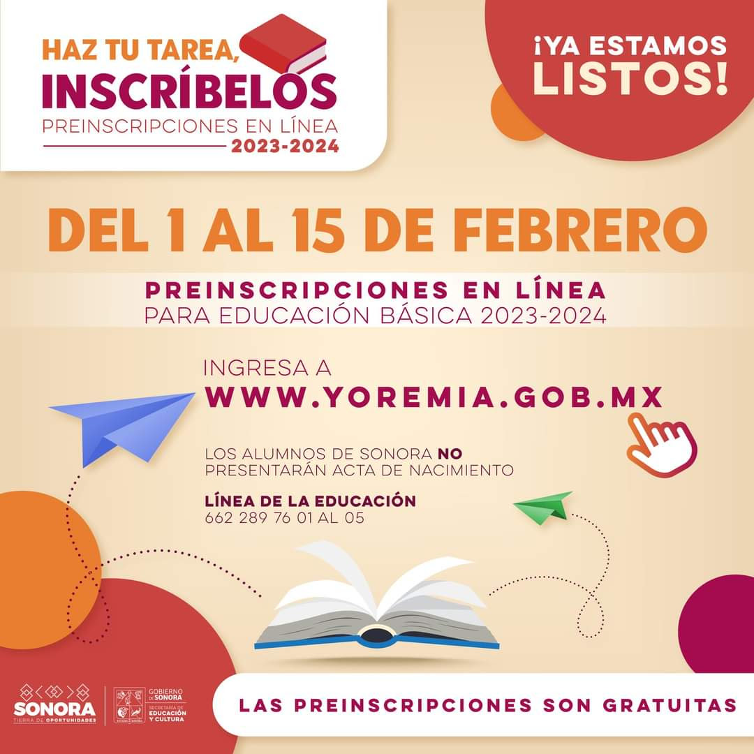 Hermosillo, Sonora; 30 de enero 2023.- Del miércoles 1 al miércoles 15 de febrero se llevará a cabo el proceso de Preinscripciones en Línea para alumnos que ingresarán a preescolar, primero de primaria y primero de secundaria en el ciclo escolar 2023-2024, anunció Aarón Grage...