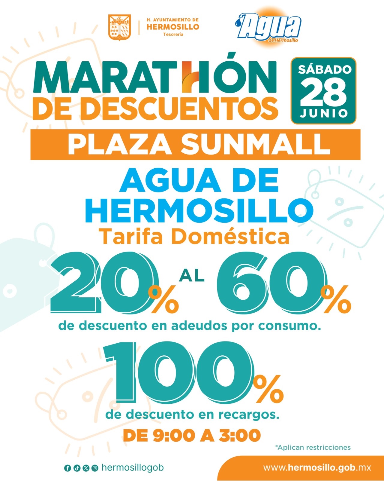 Hermosillo, Sonora; 25 de junio de 2025.- Agua de Hermosillo invita a los usuarios del servicio a aprovechar su próxima jornada de descuentos, que se llevará a cabo este viernes 27 de junio en la colonia Universidad.Durante esta jornada, los usuarios con adeudos podrán acceder a descuentos q...