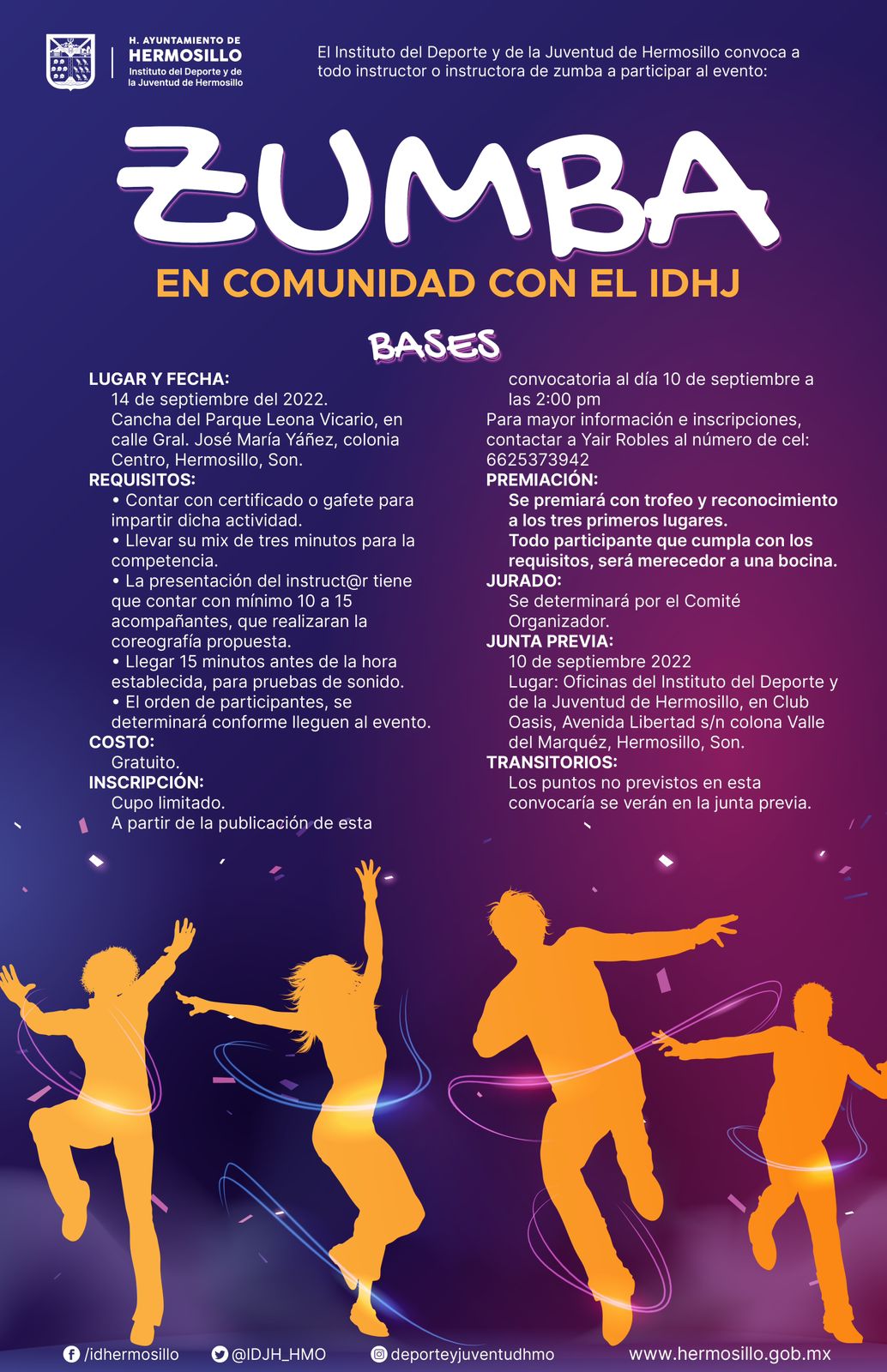 Hermosillo, Sonora; 31 de agosto, 2022.- El Instituto del Deporte y la Juventud de Hermosillo (IDJH) convoca a instructoras e instructores que deseen participar en "Zumba en Comunidad con el IDJH” y promover la activación física en las canchas del Ayuntamiento de Hermosillo.La Directora del...