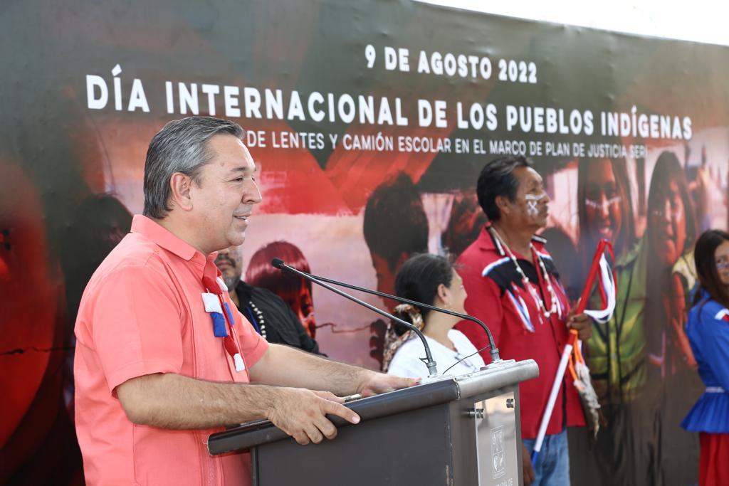 Punta Chueca, Sonora; 9 de agosto de 2022.- Las acciones para establecer condiciones de dignidad y bienestar en beneficio de la nación comcáac avanzan significativamente con la entrega de lentes graduados y transporte escolar a la comunidad seri de Punta Chueca, destacó Aarón Grageda Bustamante....