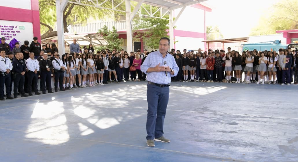 Hermosillo, Sonora; 9 de marzo, 2026.- En el marco de la ceremonia de Lunes Cívico en la secundaria 9, arquitecto Gustavo F. Aguilar Beltrán, el presidente municipal Antonio Astiazarán Gutiérrez destacó el triunfo del plantel en el concurso de calaveras con material reciclado al que convo...