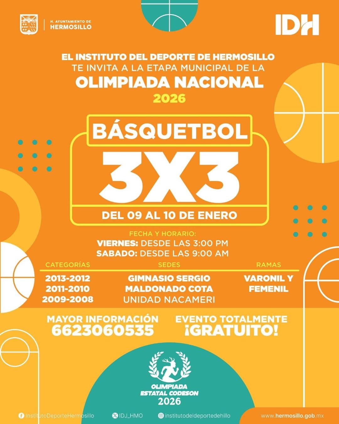 Hermosillo, Sonora; 7 de enero, 2026.-El Instituto del Deporte de Hermosillo (IDH) invita a niñas, niños y jóvenes a participar en la etapa municipal de Básquetbol 3x3, como parte del proceso rumbo a la Olimpiada Nacional 2026, evento que se llevará a cabo los días viernes 9 y sábado 10 de en...
