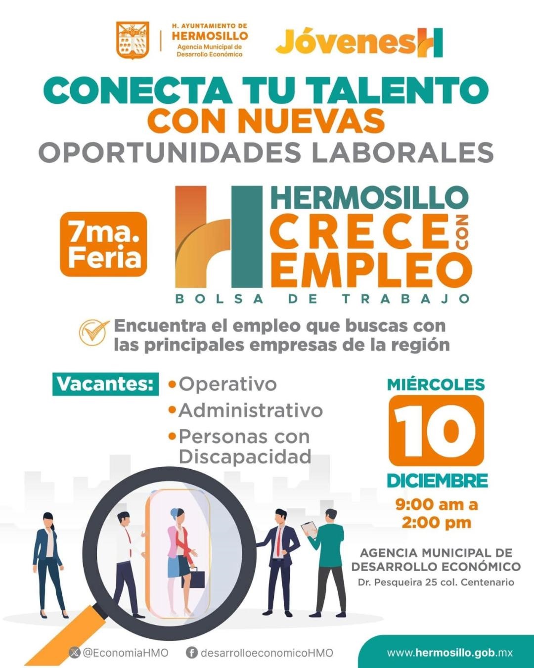 Hermosillo Sonora; 8 de diciembre, 2025.- La Agencia Municipal de Desarrollo Económico, AMDE, en coordinación con el Instituto Hermosillense de la Juventud invita a la Séptima Feria Hermosillo CRECE con Empleo el próximo miércoles 10 de diciembre. La bolsa de trabajo que o...
