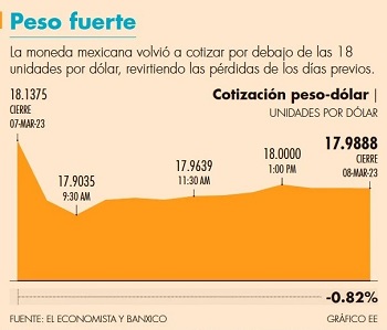 Ese mismo día, la Secretaría de Turismo dio a conocer que estima para el presente año una derrama de 31,169 millones de dólares (mdd) en divisas por visitantes internacionales, lo que implicaría un aumento de 11.3 por ciento contra 2022; y también el lunes, se dio a conocer que la Inversión Fija Bruta en México avanzó 2.7 por ciento mensual en diciembre, su mejor crecimiento en 17 meses.