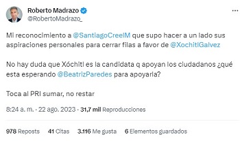 Exactamente una hora después, siguió el impresentable de Madrazo, quien a las 8:24 del mismo 22 de agosto, posteó: