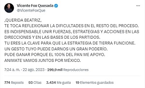 Como suele suceder, los mensajes fueron retuiteados cientos de miles de veces agregando todo tipo de comentarios e insultos, ante los cuales Beatriz Paredes se ha mantenido incólume, mostrando mesura, integridad y una calidad moral que evidentemente no tiene ninguno de estos dos malnacidos, quienes seguramente son azuzados por Claudio X González Guajardo y las élites panistas.