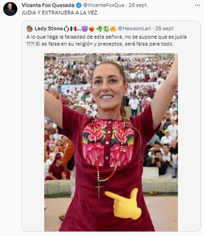 Pero el lenguaraz expresidente lo toma, lo repostea y con un brevísimo mensaje pero cargado de veneno, agrega "JUDÍA Y EXTRANJERA A LA VEZ” (lo escribe con mayúsculas porque seguramente en su ignorancia cree que así evita las frecuentes faltas de ortografía que comete al escribir). Con ello, este mequetrefe homofóbico, convierte un mensaje común y corriente en antisemita y racista, el cuál en virtud del proceso electoral se vuelve de nuevo en contra de la candidata de la oposición, Bertha Xóchitl Gálvez.